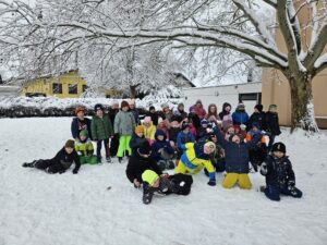 Die 4b nutzte den frischen Neuschnee und verbrachte eine fröhliche Stunde im Freien. Nachdem es den ganzen Vormittag geschneit hatte, verwandelte sich der Schulhof in eine perfekte Winterlandschaft. Die Kinder spielten begeistert Fußball im Schnee, machten Schneeengel und veranstalteten eine ausgelassene Schneeballschlacht. Ein winterliches Erlebnis, das für viel Bewegung, Lachen und rote Wangen sorgte.