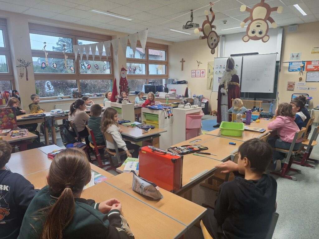 Am 5. Dezember 2025 besuchte uns der Nikolaus. Einiges konnte er uns zu unserem Erstaunen über uns und unsere Klasse erzählen. Wir bekamen viel Lob, aber auch ein paar Verbesserungsvorschläge für unsere Klassengemeinschaft. Danach sangen wir dem Nikolaus noch ein Lied vor. Weil wir so brav sind, hat jedes Kind ein Nikolaussackerl bekommen. Natürlich besuchte der Nikolaus alle Klassen in der Schule.