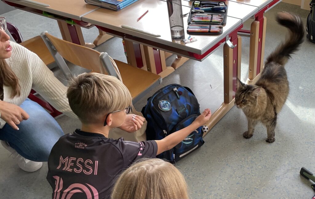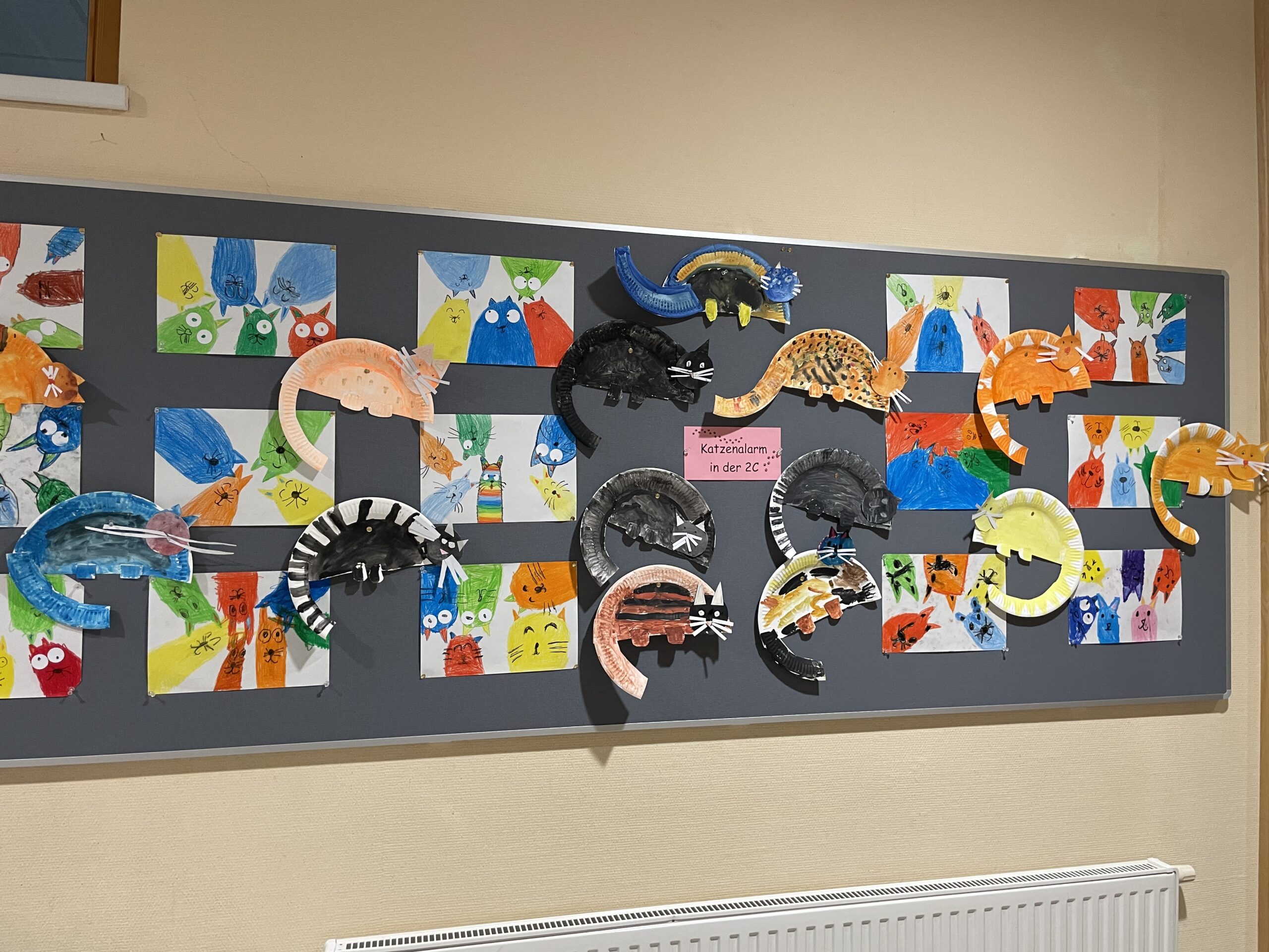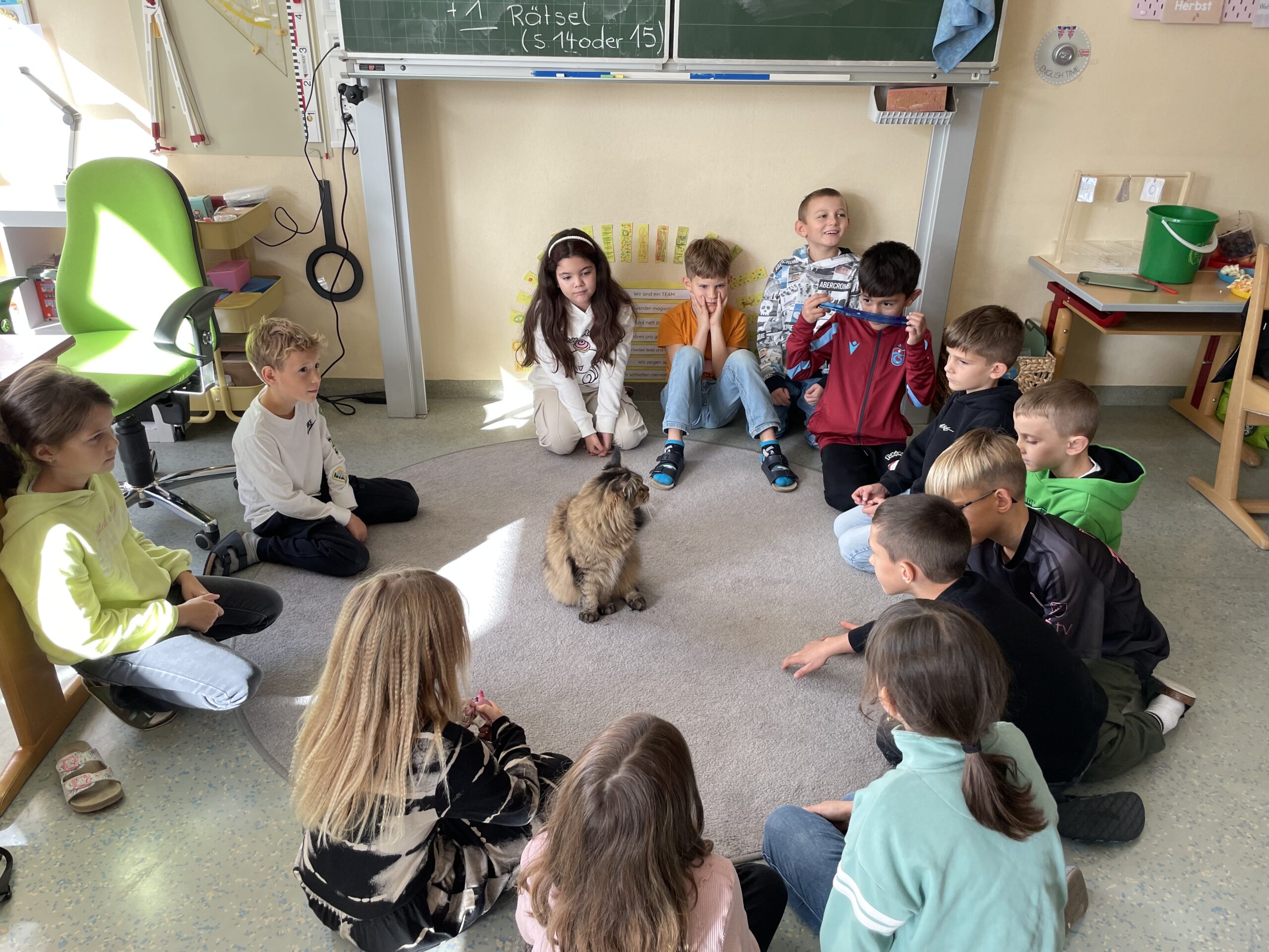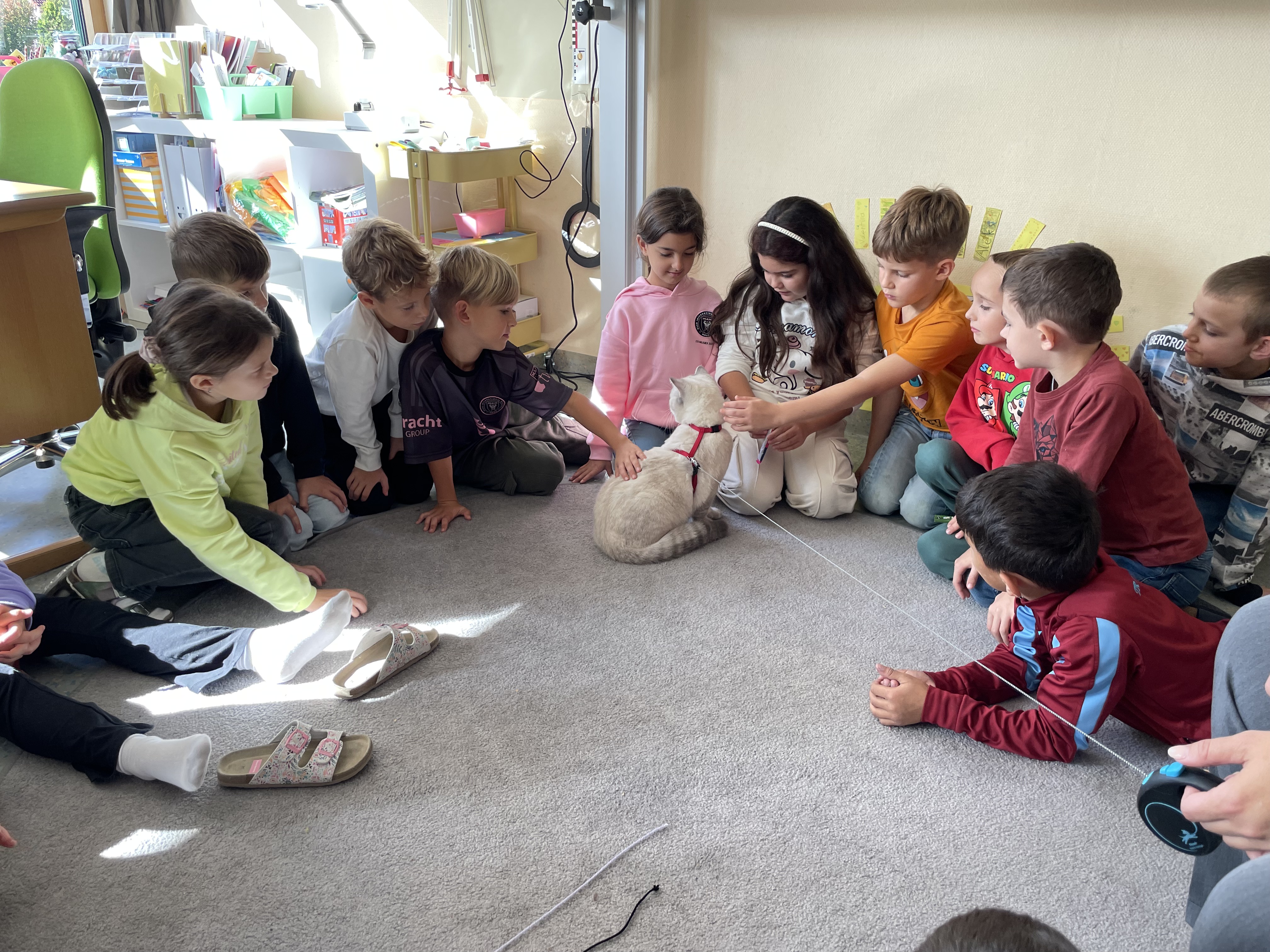 Auch im Sachunterricht haben wir viel gelernt – zum Beispiel, was Tiere zum Leben brauchen und dass man für ein Haustier Verantwortung übernehmen muss. In Musik sangen wir Lieder wie „Sophie hat einen Hamster“ oder den „Katzentatzentanz“. In Technik und Design gestalteten wir Schildkröten aus Modelliermasse, und in Kunst drehte sich alles um Katzen. Selbst im Turnunterricht blieben wir beim Thema: Wir spielten Bewegungsstationen mit Tieraufgaben und hatten viel Spaß dabei.